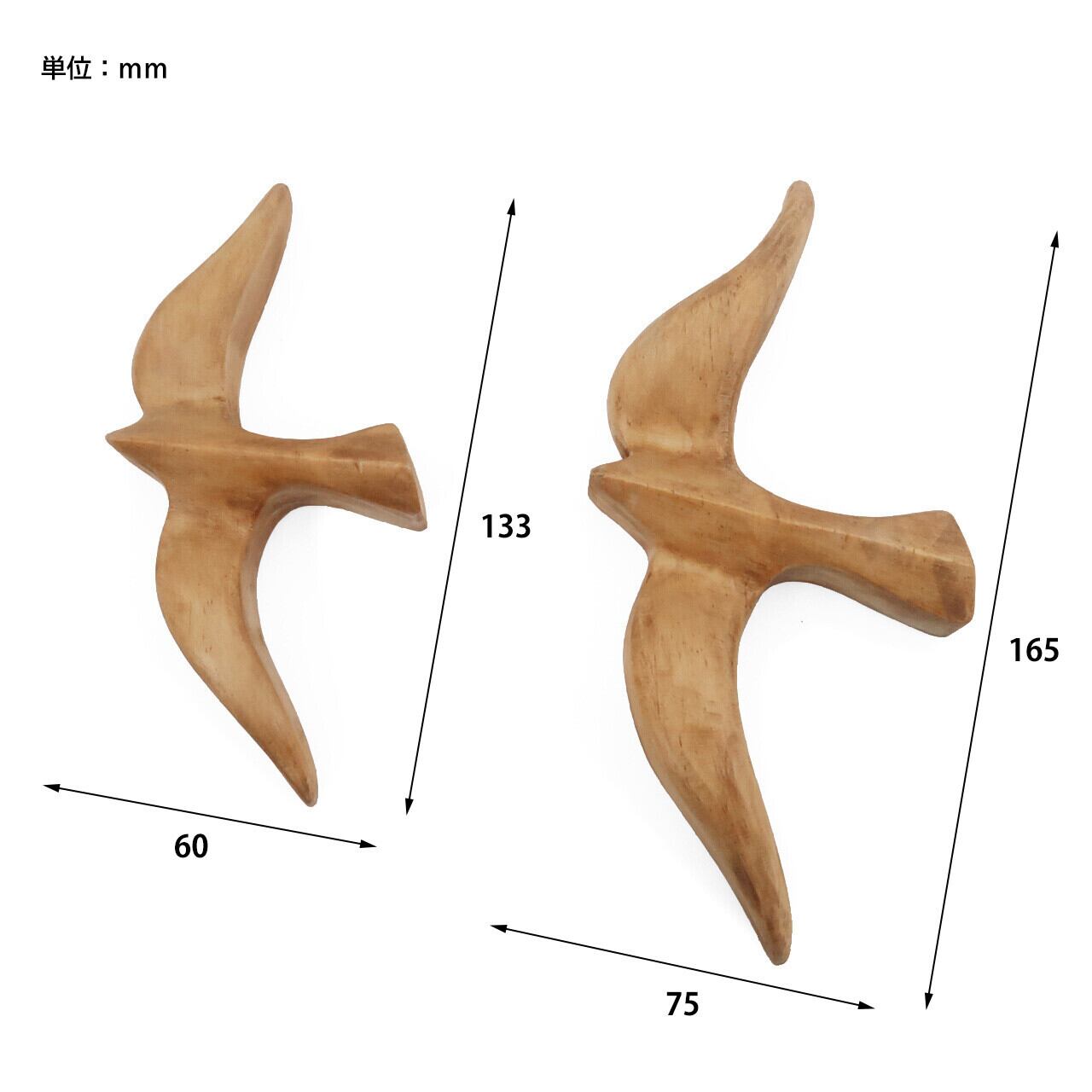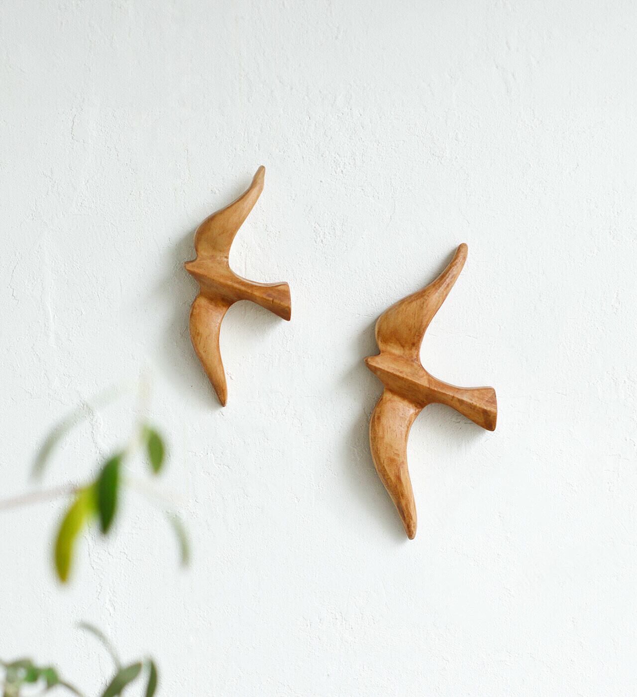 羽を大きく広げて羽ばたく鳥の姿を、木材ならではの柔らかな曲線で表現したウォールオブジェです。