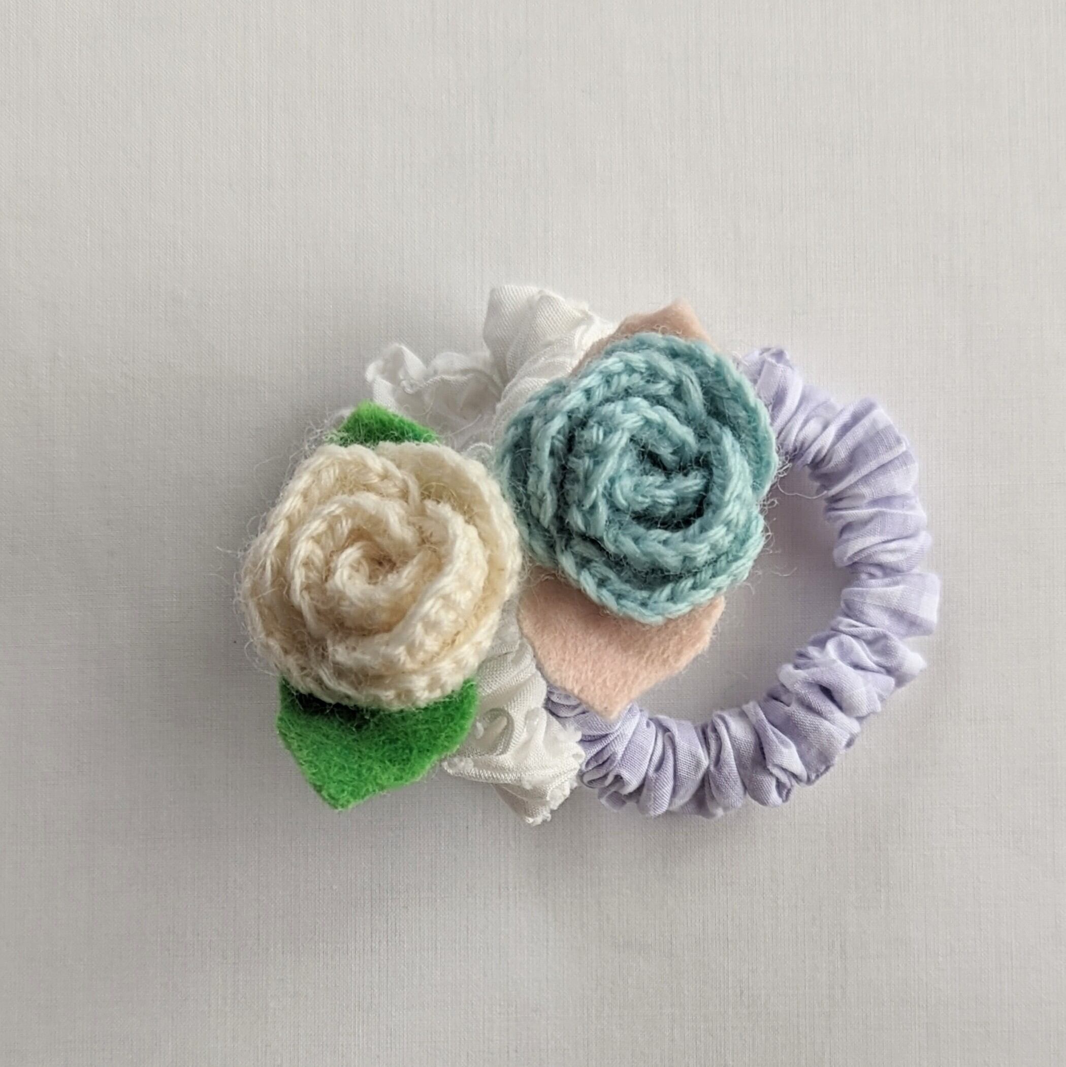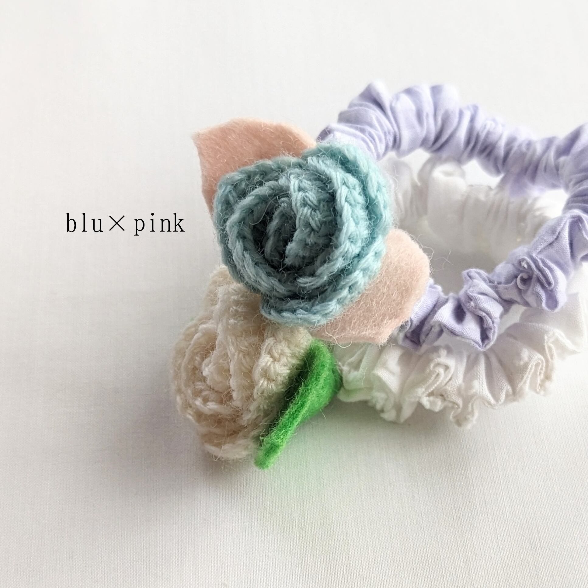 明るめのブルーの薔薇にピンクの葉を合わせた